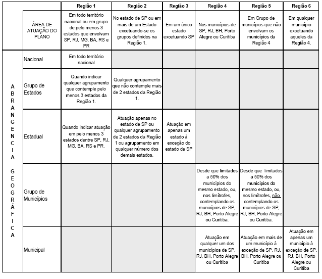 A abrangência geográfica do plano de saúde e as localidades definidas para área de atuação serão compatibilizadas, classificando a região segundo as definições do quadro abaixo.