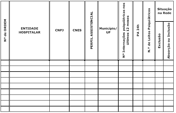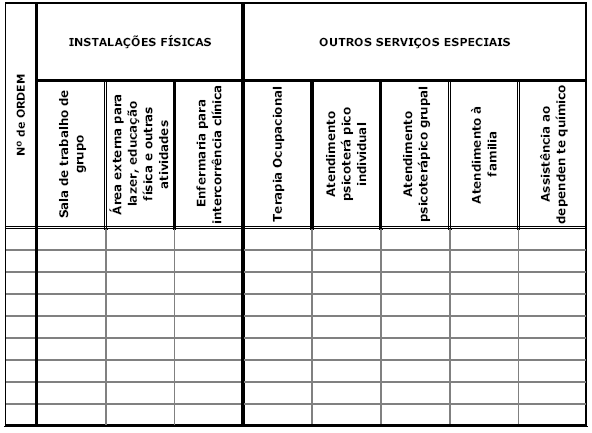 As unidades psiquiátricas têm análise específica devendo ser informado quanto às instalações dos leitos, existência de salas de trabalho em grupo, área externa para lazer e enfermaria para intercorrências clínicas e quanto a serviços, terapia ocupacional, atendimento psicoterápico individual e grupal, atendimento a família e ao dependente químico, nos moldes do Anexo IIIB.