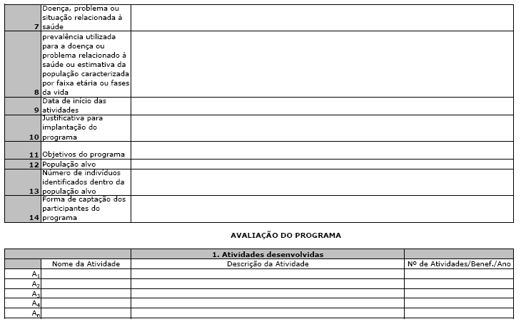 1. Área de atenção à saúde: É a especificação da área de atenção que será abordada pelo programa. Pode ser: Saúde do Adulto e do Idoso, Saúde da Criança e do Adolescente, Saúde da Mulher, Saúde Mental, Saúde Bucal e Fatores de Risco.